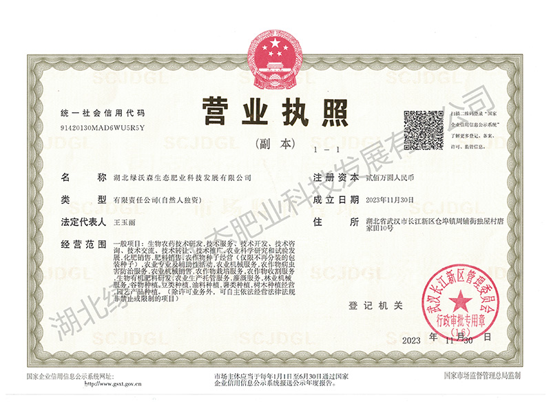 湖北綠沃森生態(tài)肥業(yè)科技發(fā)展有限公司是一家集科研開發(fā)、生產(chǎn)、貿(mào)易為一體的現(xiàn)代化高科技企業(yè)。公司成立于2023年11月30日,公司坐落于湖北省武漢市,公司擁有管理人員23人,高等工程師3人,技術(shù)人員12人,工人150余人,占地面積150畝,年生產(chǎn)能力超過100萬噸。